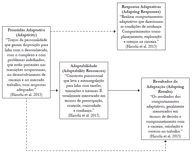Hirschi et al. (2015) discutem como os conceitos de prontidão adaptativa, adaptabilidade de carreira, respostas adaptativas e resultados da adaptação estão sendo utilizados nas pesquisas quando associados à adaptabilidade de carreira. Em síntese, a prontidão adaptativa, relacionada aos traços de personalidade, promoveria uma maior adaptabilidade de carreira que, por sua vez, desencadearia um conjunto de respostas adaptativas, tais como o planejamento, a decisão, a exploração e a autoeficácia, que levariam ao alcance de bons resultados decorrentes da adaptação ao trabalho e à carreira (Hirschi et al., 2015; Rudolph et al., 2017). Esses construtos são relevantes para a compreensão do conceito empregabilidade, descrito a seguir.
