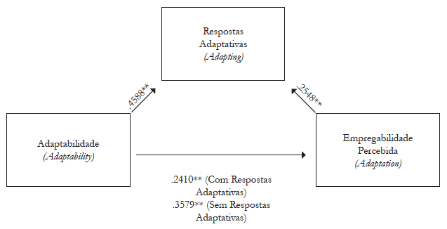 No teste das hipóteses, os resultados da relação entre a adaptabilidade de carreira e a empregabilidade percebida confirmaram as expectativas teóricas, uma vez que foi observado um efeito direto e significativo da adaptabilidade de carreira sobre a empregabilidade percebida. Em um segundo momento, confirmou-se o poder mediador das respostas adaptativas, pois se observou queda dos valores da trajetória direta (adaptabilidade de carreira -> empregabilidade percebida) quando as respostas adaptativas foram incluídas na equação. Apesar da diminuição dos valores, a trajetória continuou sendo significativa, o que sugeriu um efeito mediador parcial das respostas adaptativas em relação à empregabilidade percebida.