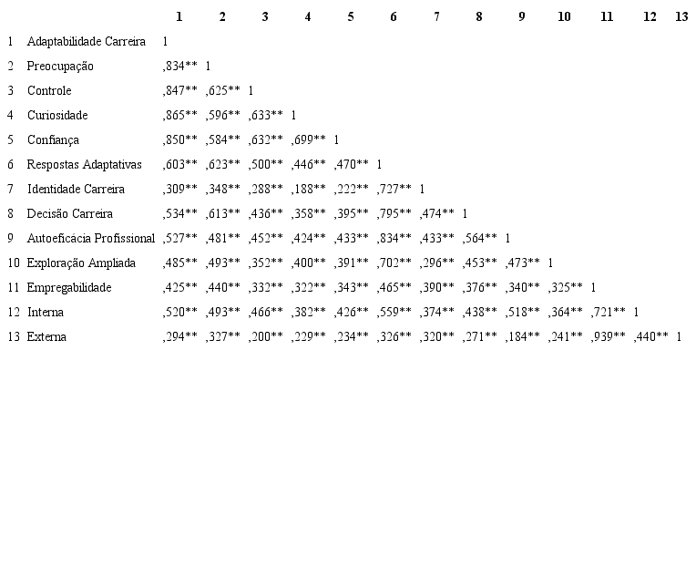 Em relação às Respostas Adaptativas, sobressai-se a correlação entre a Autoeficácia Profissional e a Decisão de Carreira (r=0,56 - p<0,01) e Decisão de Carreira e Identidade de Carreira (r=0,47 - p<0,01). Dando ênfase às correlações Empregabilidade Percebida, a correlação entre a dimensão interna e externa foi positiva de intensidade moderada (r=0,44 - p< 0,01). Ademais, as medidas globais de cada uma das escalas enfocadas nesse estudo correlacionam de forma positiva, direta e de intensidade moderada, com a amplitude das relações situada entre 0,42 e 0,61 (p<0,01).
