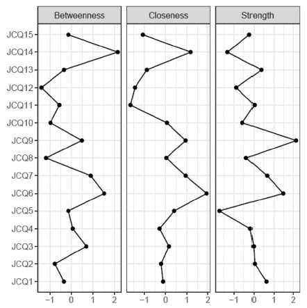 A análise de comunidades e as medidas de centralidade revelaram o papel fundamental do item seis da EART, o qual remete à frequência com que o trabalhador “pensa em como o seu trabalho lhe traz sentido e propósito de vida”. O item seis surgiu como um nodo central (Figura 1), o qual apresentou relações de grande magnitude com os demais nodos do sistema. As medidas de centralidade (Figura 2) revelaram que o item seis apresentou um elevado grau de proximidade, ou seja, um maior número de conexões com todos os demais itens. Seu grau de conectividade foi expressivo, indicando ser esse o caminho mais curto (elo) entre todos os pares de dados conectados na rede. A força do item seis indicou seu poder de estabelecer relações de maior magnitude com outros itens.