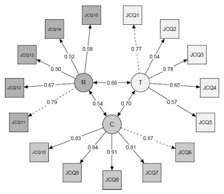 Com o objetivo de confirmar a estrutura de três fatores da EART encontrada no Estudo 1, realizou-se uma análise fatorial confirmatória para verificar os ajustes do modelo teórico do job crafting composto de três fatores (Slemp & Vella-Brodrick, 2013) aos dados coletados na amostra de profissionais de uma organização privada do Estado de São Paulo. Foram considerados os índices de Tuker-Lewis Index (TLI ≥ 0,90) e Root mean square error of approximation (RMSEA ≤ 0,08, com intervalo de confiança de 95%) (Brown, 2006; Jackson, Gillaspy Jr., & Purc-Stephenson, 2009). As análises foram conduzidas por meio do software R e do pacote Lavaan (Rosseel, 2012). Valores faltantes (missing values) representaram menos de 1% dos dados e nenhum procedimento de imputação foi adotado.
