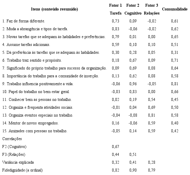 A análise paralela (Timmerman & Lorenzo-Seva, 2011) demonstrou que a solução de três fatores é adequada à escala, corroborando os pressupostos teóricos do construto do job crafting (Slemp & Vella-Brodrick, 2013; Wrzesniewski & Dutton, 2001). O poder de explicação da estrutura de três dimensões da amostra é superior àquela esperada ao acaso (dados simulados). Portanto na análise fatorial exploratória, o número de fatores foi limitado a três. Nesse modelo, no qual foi investigada a solução multifatorial de três fatores de primeira ordem, obteve-se índices de ajuste bastante satisfatórios: TLI (= 0,948) e resíduos nos patamares aceitáveis RMSEA (90% IC) = 0,063 (0,045 - 0,077). Todos os itens apresentaram carga fatorial adequada em suas respectivas dimensões (Tabela 1), conforme proposto teoricamente (Slemp & Vella-Brodrick, 2013), à exceção do item cinco, pertencente à dimensão da tarefa no modelo original. Esse item apresentou carga cruzada, sendo explicado tanto na dimensão da tarefa (λ = 0,30), como na dimensão cognitiva (λ = 0,28). Nesse modelo resultante da análise fatorial exploratória, os fatores estiveram significativamente associados e seus índices de consistência interna foram satisfatórios (Tabela 1).
