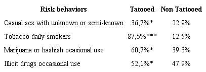 As regards the participants’ sexual life, the majority of both non-tattooed (87.9%) and tattooed (82.3%) participants reported having had two or less sexual partners in the previous year, whereas 10.2% of the non-tattooed ones and 13.3% of the tattooed ones cited 3 to 5 sexual partners in the same period; the same percentage (1.9%) in both groups had had between 6 and 10 sexual partners. There was no significant statistical association between the variables [χ2 = 4.91; gl = 3; p = NS]. Table 1 shows the percentages of variables associated with risk behaviors with significant association.