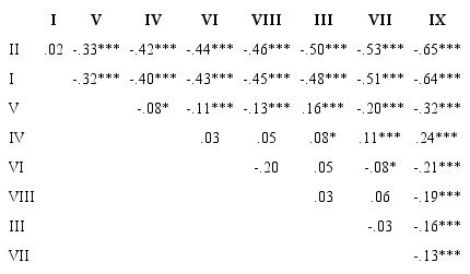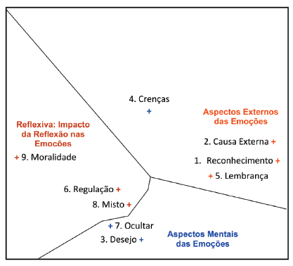 A análise SSA está apresentada na Figura 1, observando-se a partição do campo dimensional euclidiano da projeção em uma estrutura polar que aponta para as fases da CE de Pons et al., (2004). Em sentido horário, da direita para a esquerda, a estrutura polar apresenta uma primeira região de contiguidade conformada pelos elementos relacionados aos aspectos da fase externa das emoções, isto é, os três componentes II (causas externas), I (reconhecimento) e V (lembrança), nesta ordem. Em seguida, na parte inferior da projeção, há dois componentes da fase mental das emoções: VII (ocultar) e III (desejo); do lado esquerdo da projeção, encontram-se localizados os três componentes da fase reflexiva, isto é, VIII (misto), VI (regulação) e IX (moralidade).