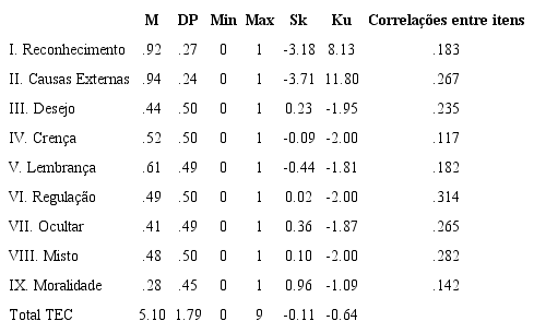 Neste estudo, todos os componentes do TEC (cf. Tabela 1.) apresentam valores adequados de assimetria (Sk) e curtose (Ku), sugerindo uma distribuição normal dos dados (Field, 2011). No entanto, os componentes I (reconhecimento) e II (causas externas) apresentam valores inaceitáveis devido às altas taxas de sucesso. Estes resultados eram esperados, uma vez que de acordo com o desenvolvimento da CE estas dois componentes emergem nos primeiros três anos de vida da criança (Franco & Santos, 2015), pelo que existe uma elevada taxa de sucesso nesta amostra composta por crianças mais velhas. Por outro lado, Rocha, Roazzi et al., (2015) defendem que, apesar de os valores destes dois componentes serem inaceitáveis do ponto de vista psicométrico, a sua utilização em crianças mais velhas permite-lhes familiarizar-se com os objetivos do teste e o seu conteúdo. As correlações totais entre os itens são relativamente baixas (cf. Tabela 1), especialmente nos componentes IV (crenças) e IX (moralidade), no entanto, a maioria encontra-se no intervalo .15 a .20, considerado adequado em medidas que avaliam características amplas, como a CE (Antony & Barlow, 2011).
