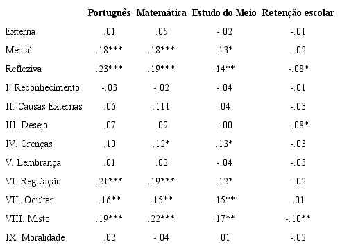 Foi utilizado o coeficiente de correlação ponto-bisserial para observar a associação entre as notas e as fases da CE (cf. tabela 3). Quando controlada a idade, foram encontradas relações pequenas, mas significativas, entre as notas de português, matemática e o estudo do meio e as fases mental e reflexiva.