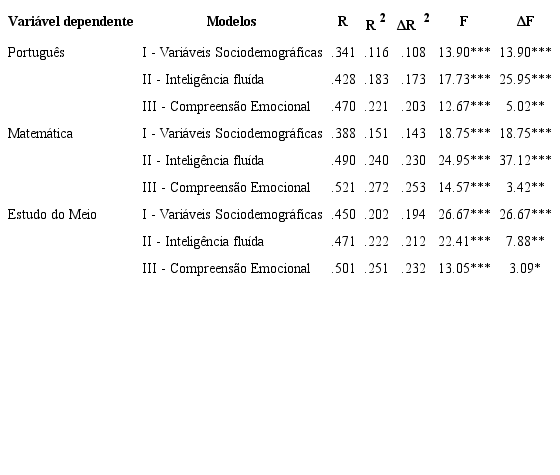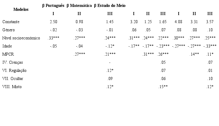 Com base nos resultados das correlações, foi efetuada uma análise de regressão múltipla (método Enter) para investigar se os componentes VI (regulação), VII (ocultar) e VIII (misto) eram preditores do rendimento académico em Português, e se os componentes IV (crenças), VI (regulação), VII (ocultar) e VIII (misto) eram preditores do rendimento académico em Matemática e em Estudo do Meio.