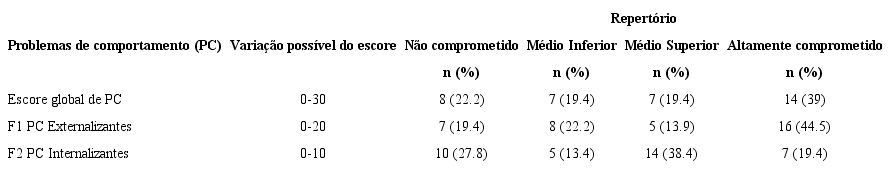 A Tabela 2 apresenta os dados descritivos correspondentes aos problemas de comportamento das 36 crianças avaliadas pelos respectivos cuidadores informantes (SSRS-cuidador) em frequência absoluta e relativa de crianças que apresentaram repertório não comprometido, médio inferior, médio superior e altamente comprometido em problemas de comportamento.