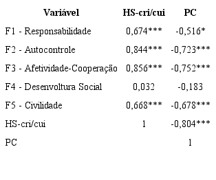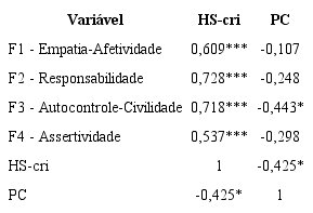 Na Tabela 3, apresentam-se os coeficientes de correlação (r de Pearson) e significância estatística referentes às relações entre habilidades sociais - cada escore fatorial e escore geral, ambos na autoavaliação - e problemas de comportamento.