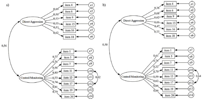 All saturations were positive and non-zero (λ≠0; p < 0.001). In the victimization scale, the Direct Aggression factor had saturations varying between 0.35 and 0.69, presenting Cronbach’s alpha of 0.71 and a CR of 0.71. On the other hand, in the Control / Monitoring factor, saturations ranged from 0.58 to 0.81, resulting in α of 0.92 and a CR of 0.91. In the perpetration scale, the Direct Aggression factor had saturations varying between 0.16 and 0.77, presenting a Cronbach’s alpha of 0.67 and a CR of 0.69. On the other hand, in the Control / Monitoring factor, saturations ranged from 0.33 to 0.74, resulting in α of 0.84, and a CR of 0.83.
