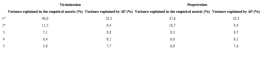 Since the CDAQ is composed of two scales (victimization and perpetration), the results will be presented individually for each of them. For the victimization scale, the Kaiser-Meyer-Olkim (KMO = 0.88) and the Bartlell sphericity test [χ2 (190) = 2074,1; p < 0.001) indicated the suitability of the measure to perform the Exploratory Factor Analysis (EFA). The perpetration scale also demonstrated suitability of its factorization matrix through EFA, as observed in the KMO value (0.83) and the Bartlett sphericity test [χ2 (190) = 1921.4; p <0.001). Then, the PA recommended the extraction of two factors in both scales of the questionnaire, considering that the explained variance of the third factor of the empirical data matrix was inferior to the one obtained through the random data matrices. Table 1 summarizes the results for the first five factors.