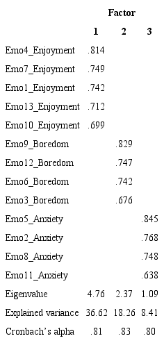 For gathering data from the children, a scale was used that was adapted from the Achievement Emotions Questionnaire - Elementary School (Pekrun, Lichtenfeld, Killi, & Reiss, 2007) which, in its original version, focused on emotions associated with the learning of mathematics. The items were adjusted to reading situations. They were presented to the children as statements which were read aloud, and the answer scale was pictorial, a sequence of five faces with different expressions which gradually became more identifiable as the emotion they referred to. Thus, the sequences of facial expressions were different for the three emotions in question, with different versions for boys or girls as well. In the factorial analysis carried out, the three-dimensional structure was clear and consistent with the original one, showing altogether an explained variance percentage of 63.29% and adequate values of internal consistency (Hair, William, Barry, Rolph, & Ronald, 2010) which varied between .80 and .83 (Table 1). The scale was thus composed of 13 items, considering three emotions: enjoyment (e.g. “I like reading”), boredom (e.g. “I think reading is so boring that all I want is to stop”) and anxiety (e.g. “When I have to read aloud I get nervous”).
