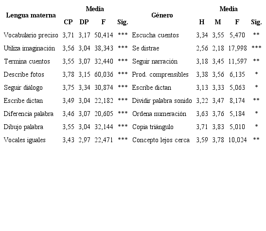 Seguidamente, el análisis de rendimiento académico en función de la lengua materna presenta mejores resultados del alumnado castellano parlante que el darijo parlante en todas las áreas. En cuanto a la dimensión del lenguaje, la mayoría de las categorías muestran datos más positivos en aspectos relacionados con el proceso expresivo del lenguaje. Unas diferencias en su progreso que se asocian a una identidad marcada por la lingüística (Gineste, 2006). Así pues, la utilización de una lengua materna no estructurada (darija) ni asociada a la oficial merma la captación del mensaje y su posterior utilización. Querejeta (2017) destaca la importancia de la expresión escrita y la conciencia fonética en el proceso de lecto-escritura y como estas influyen en los logros académicos (Gómez, García, Vila, Elosúa y Rodríguez, 2014). Del mismo modo, las relaciones entre grafemas y fonemas que desarrollan los niños a través de la escritura de palabras les van a permitir fomentar habilidades que se pueden transferir a la lectura (Albuquerque y Alves, 2017).