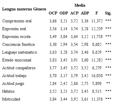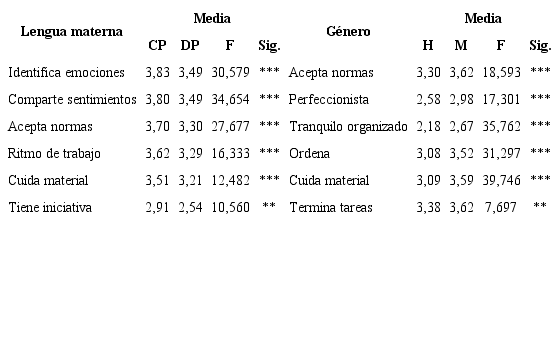 En la tabla 2 se expresan los resultados del rendimiento académico en habilidades sociales según la lengua materna y el género de estos alumnos. En el primer caso, observamos que, para cada subgrupo que engloba el factor “habilidad social”, las diferencias en la media de rendimiento son desiguales según sea la lengua materna del alumno castellana o darija. Estas diferencias de medias son estadísticamente significativas a un nivel de <.001 para cada una de las variables, a excepción de la categoría tiene iniciativa, cuya probabilidad de errar a la hora de afirmar que existen diferencias significativas en el rendimiento es de <.01. Como puede verse, los resultados en esta área de los alumnos de lengua materna castellana tienen un rango medio de 0,92 (valor máximo: 3,83 - valor mínimo: 2,91), mientras que los resultados en alumnos de lengua materna darija son de 0,93 (valor máximo: 3,49 - mínimo: 2,54) y, por lo tanto, se comprueba la menor variabilidad de resultados en el alumnado de lengua materna castellana.