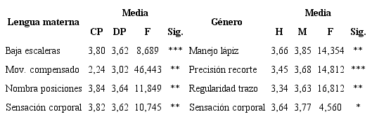 En cuanto a la variable género, las medias de rendimiento en las niñas son superiores que las de los niños, con un nivel de significación de de<.05 en la categoría sensaciones corporales, <05 en el manejo del lápiz y de p <.001 para la regularidad en el trazo la y precisión recorte, estas últimas relacionadas con un desarrollo óptimo en la utilización de músculos más pequeños “motricidad fina”.