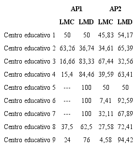 Al revisar los datos de los alumnos de cada centro educativo según el periodo y la lengua materna (ver tabla 5) se evidencia que los porcentajes de los castellanos parlantes disminuyen del primer periodo al segundo en los centros educativos C1 (- 4,17%); C2 (- 28,65%); el C4 (-24,19%); C8 (9,92%) y C9 (19,42%). En cambio, nos encontramos un aumento de alumnos castellanos parlantes en el segundo periodo de los centros C3 (50,7%); C5 (50%); C6 (7,41%) y C7 (32,11%). Igualmente, podemos observar como los centros con mayor porcentaje de alumnos darijo parlantes son el C5; C6 y C7 (100%) para el primer periodo y el C9 (94,42%); C6 (92,59%) y C8 (72,41%) en el caso del segundo periodo.