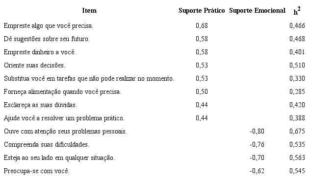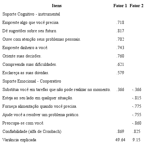 Destarte, traz-se a proposição de dois fatores: Suporte Cognitivo-Instrumental e Suporte Emocional-Cooperativo, constituindo duas dimensões relevantes da percepção de suporte social para o público trabalhado nessa validação, já que representam perspectivas do apoio que podem estar relacionadas ao enfrentamento das implicações psicossociais da pobreza em uma perspectiva multidimensional. Griep, Chor, Faerstein, Werneck e Lopes (2005) também apresentam o apoio material em uma dimensão separada do apoio emocional, por considerar a diferença entre esses dois aspectos.