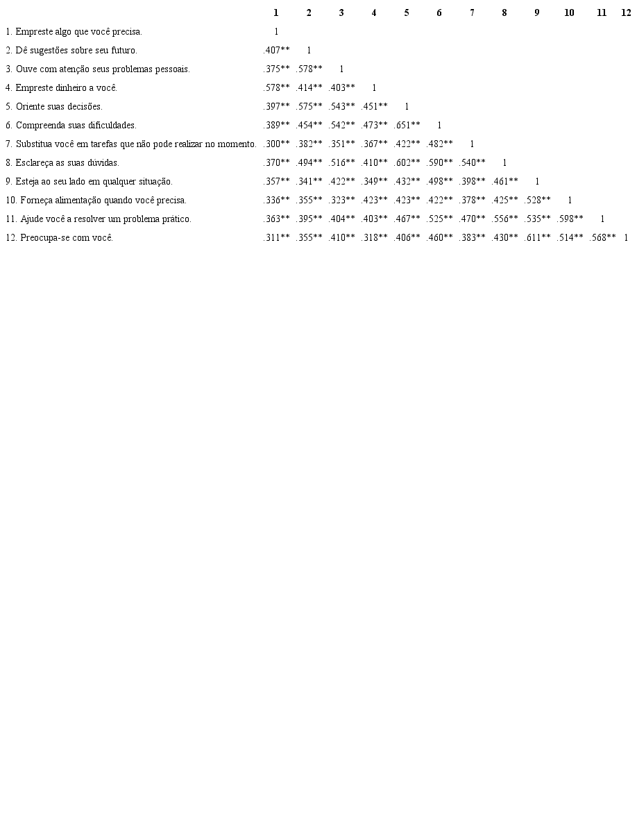 Ao realizar análises de correlação entre os itens das variáveis da Escala Reduzida de Percepção de Suporte Social (Tabela 2), foram identificadas correlações positivas e elevadas em todos os itens da versão reduzida. Identifica-se, assim, uma excelente relação entre os itens constituintes da escala.