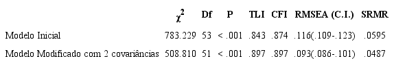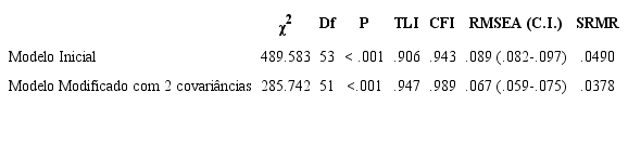 Analisando os índices da AFC (Tabela 4), identifica-se que o modelo mesmo com inclusão de duas covariâncias não obteve índices satisfatórios do CFI (0,897) e do TLI (0,897), ficando abaixo de 0,90. O RMSEA está distante do valor indicado como adequado com 0,093(IC90% = 0,086-0,101). O único índice que seria considerado bom é o SRMR (0,0487), pois está abaixo de 0,05. Apesar disso, essa disposição de índices não contribui para uma validação do ajuste do modelo original.