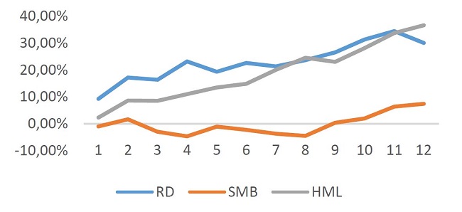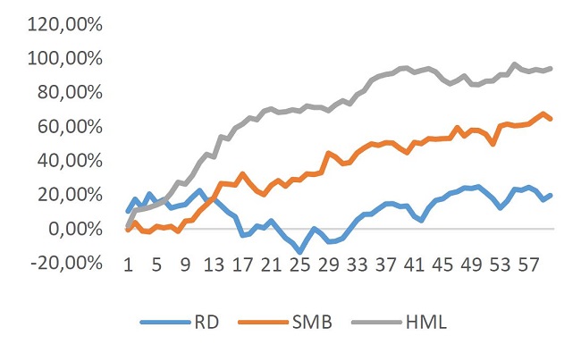 No curto prazo, observa-se que estratégias fundamentadas no valor patrimonial e no retorno foram mais rentáveis, com vencedoras vencendo até onze meses. A partir de um aumento do horizonte temporal para sessenta meses (Figura 2) se evidenciou um melhor resultado de empresas menores em relação às maiores, conforme SMB ou SmallMinus Big, e do B/M diferencial, este proporcionando, em cinco anos, retornos acima de 80%. O retorno diferencial aparentou overreaction a partir do 25º mês, partindo de um valor negativo e terminando a série com 19,69%.