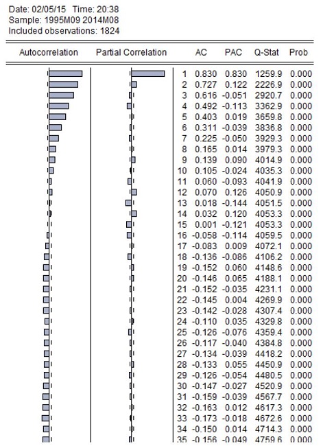 Verificada a estacionariedade da série, utilizou-se aqui o correlograma para definir se o melhor modelo de previsão é Auto Regressivo (AR), neste caso sendo o retorno influenciado pelo seu resultado no mês(es) anterior(es), ou de Média Móvel (MA), com o retorno atual auto correlacionado à sua média no(s) período(s) anterior(es). No correlograma, a função de autocorrelação indica a tendência de ser auto regressivo e a autocorrelação parcial orienta para o padrão de média móvel.