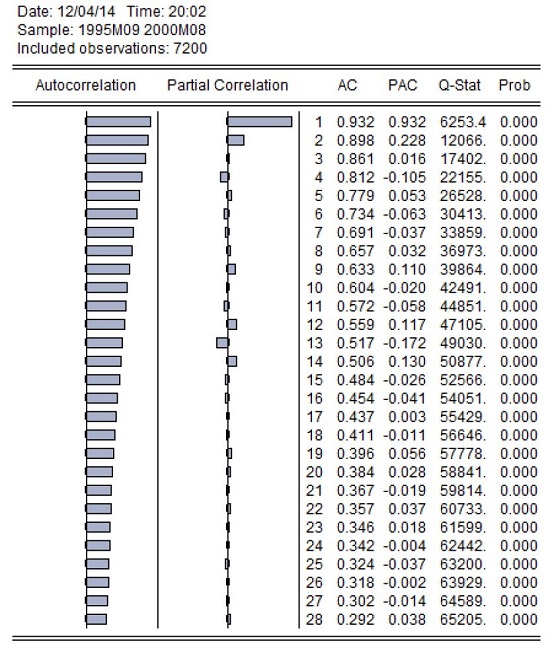 Em uma análise de longo prazo, foram verificados os mesmos problemas dos pressupostos dos resíduos e aplicadas as mesmas medidas corretivas, com uma defasagem de 1 mês para os retornos. A escolha desta defasagem foi justificada pelo correlograma apresentado a seguir (Figura 4) e indicativo de que se trata de um modelo AR(1).