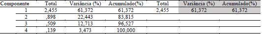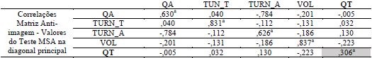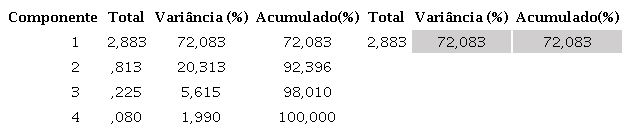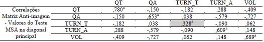Na sequência foram observados os valores constantes da matriz anti-imagem de correlações, os quais indicam o valor do teste de KMO para cada variável analisada e, portanto, devem ser retiradas as que apresentam valor menor do que 0,5 (BEZERRA, 2009). Como indicação do poder de explicação das variáveis, o SPSS gera a tabela de comunalidades, a qual pode ser utilizada como critério de eliminação de certos atributos com baixa explicação visando ao aumento do total de variância explicada (op. cit., 2009).