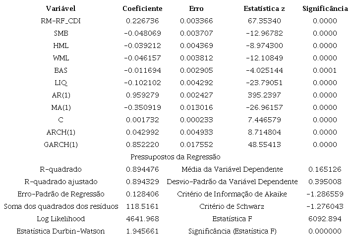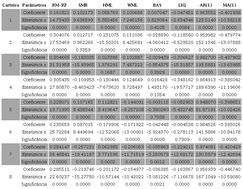 Na Tabela 9 são apresentados os coeficientes, testes z e significância no modelo GARCH(1,1), se tratando do modelo de 5 fatores estimado neste artigo com o acréscimo dos componentes de variância condicional ARCH e GARCH.