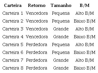 As 80 ações da primeira iteração foram agrupadas conforme retorno anormal acumulado nos doze meses anteriores, ficando 40 ações em cada grupo. Em seguida, estas 40 ações foram novamente classificadas por valor de mercado (tamanho), resultando em 20 grandes (alto valor de mercado) e 20 pequenas (baixo valor de mercado). Cada grupo de 20 ações foi então novamente dividido, a partir do B/M, em 10 ações com alto B/M e 10 ações com baixo B/M em cada carteira de retorno e valor de mercado, perfazendo o total de 8 carteiras (Quadro 3).