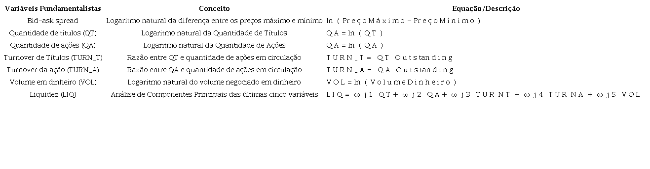 Na formação do modelo multifatorial proposto, foram acrescidas aos modelos clássicos as variáveis expressas no Quadro 4, as quais compuseram, distintamente do bid-ask-spread (BAS), um índice parcimonioso de liquidez (LIQ), conforme Eq. 4. O BAS foi incorporado separadamente do referido índice.