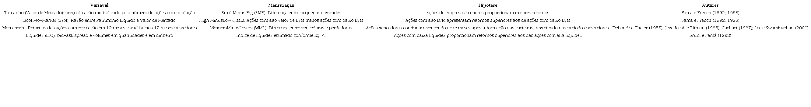 Com essa fundamentação, os fatores considerados, portanto, consistem em: risco medido pelo beta das ações; capitalização de mercado expressa pelo B/M; investimento em valor mensurado pelo tamanho ou valor de mercado, em detrimento de ações de crescimento; e momentum em contraponto à estratégia contrária.