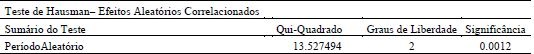 Como nesteartigo é utilizado o modelo de regressão com dados em painel, é necessário definir se o modelo adequado é o de efeitos fixos ou aleatórios, sendo neste caso aplicado o teste de Hausman. A hipótese nula deste teste é de que não há diferença significativa entre os estimadores dos erros de componentes fixos e aleatórios. Caso esta hipótese seja rejeitada, deve ser adotado o modelo de efeitos fixos, tendo em vista que os efeitos aleatórios estarão correlacionados com um ou mais regressores (GUJARATI, 2011).