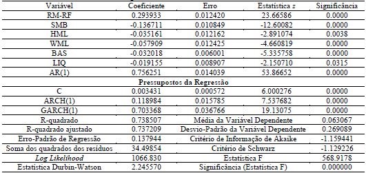 Entre os pressupostos não atendidos estão o de normalidade, conforme resultado do teste de Jarque-Bera em todas as carteiras, e o de homocedasticidade, sendo revelado pelo teste de White que em todas os resíduos foram heterocedásticos. Para solucionar este problema, a medida corretiva foi a adoção de um modelo GARCH(1,1) para cada carteira.