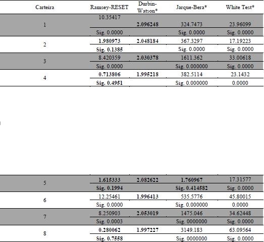 A regressão com dados em painel também foi rodada para cada carteira individualmente, sendo o teste de adequada especificação do modelo de Ramsey-RESET e os dos pressupostos dos resíduos, Durbin-Watson (autocorrelação serial), Jarque-Bera (normalidade) e White (homocedasticidade) expressos na Tabela 8.
