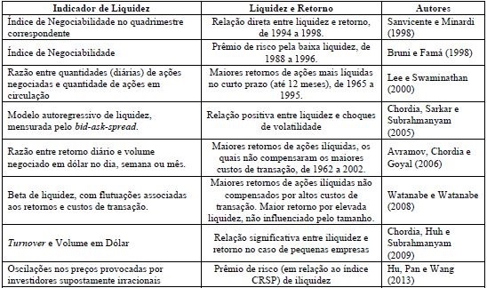 Estudos realizados no Brasil em 1998 mostraram resultados divergentes no que se refere à relação entre volume negociado e rentabilidade. Sanvicente e Minardi (1998) comprovaram uma relação direta entre liquidez e retorno, evidenciando a inexistência de prêmio pelo risco associado à baixa liquidez. Por outro lado, Bruni e Famá (1998) apresentaram conclusões favoráveis à ocorrência desse prêmio por meio de regressão cross-section do retorno em função do índice de negociabilidade já mencionado, cujo resultado revelou associação significativa entre rentabilidade e baixa liquidez.