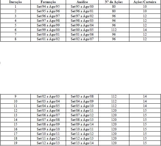 Nessa base, cuidou-se para que em cada rebalanceamento anual as carteiras tivessem, no mínimo, dez e, no máximo, quinze ações. O Quadro 2 representa as iterações realizadas em cada ano e o número de ações com o qual se trabalhou, sendo produzido o total de 1.824 observações na análise de curto prazo (até doze meses após a formação) e de 7.200 observações na análise de longo prazo (até sessenta meses após a formação).