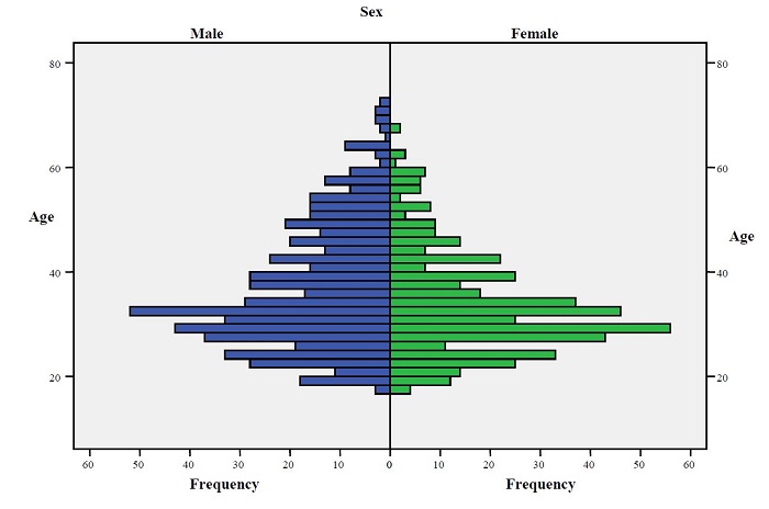Considering results according to sex, the average age of the women (average=34,88; Deviation-Pattern=0,398) is lower than that of men (Average=38,01; Deviation-Pattern=0,491) and the distribution frequencies are asymmetrically positive for both sexs, as shown in the histogram in Figure 1.