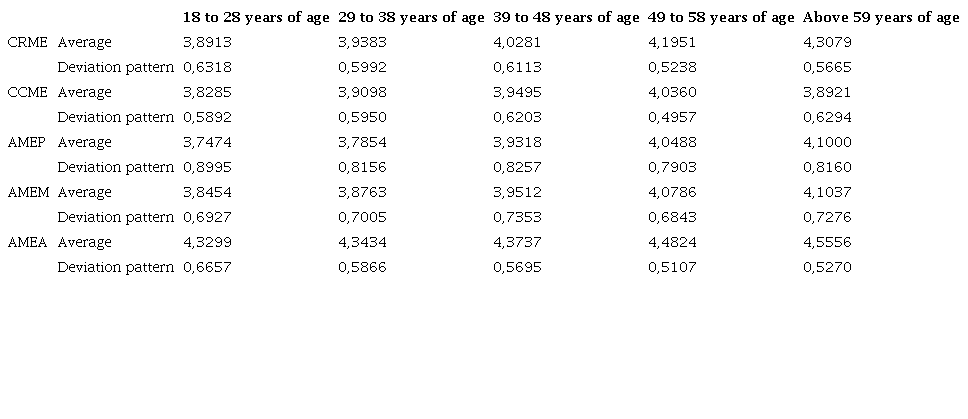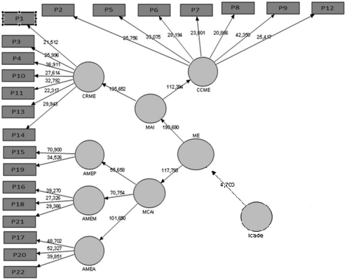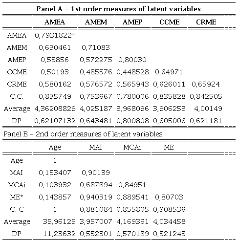 The discriminant validity was assessed parting from the comparison of the correlation loads between the dimensions AMEA, AMEM, AMEP, CCME and CRME (1st order) and Age, MAI, MCAi (2nd order) and ME (3rd order) and the AVE Roots indicated in bold on the correlation matrix's main diagonal shown in Table 5.