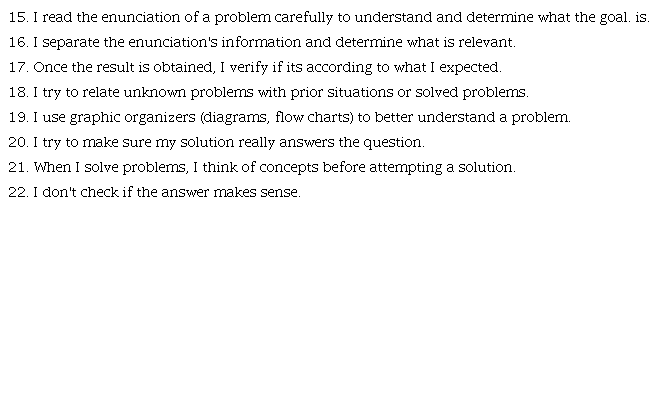 The second set is the Metacognitive Activities Inventory (MCAi) that was developed by Cooper, Sandí-Ureña and Stevens (2008) and was published in the 9th edition of the Chemistry Education Research Practice. This instrument aims to provide educators a tool that allows a deeper comprehension of how a subject perceives his abilities to solve problems and activities.