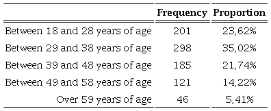 A descriptive analysis of the data revealed that the sample was composed of 851 respondents, of which 59,11% (503) were male and 40,89 (348) were female, with an average age of 37,8 years and deviation-pattern of 12,17 years.