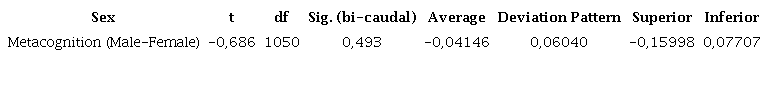 The results of the averages of equality test 't' for independent samples of Student processed with the 'metacognition' scores according to sex are synthesized in Table 9.