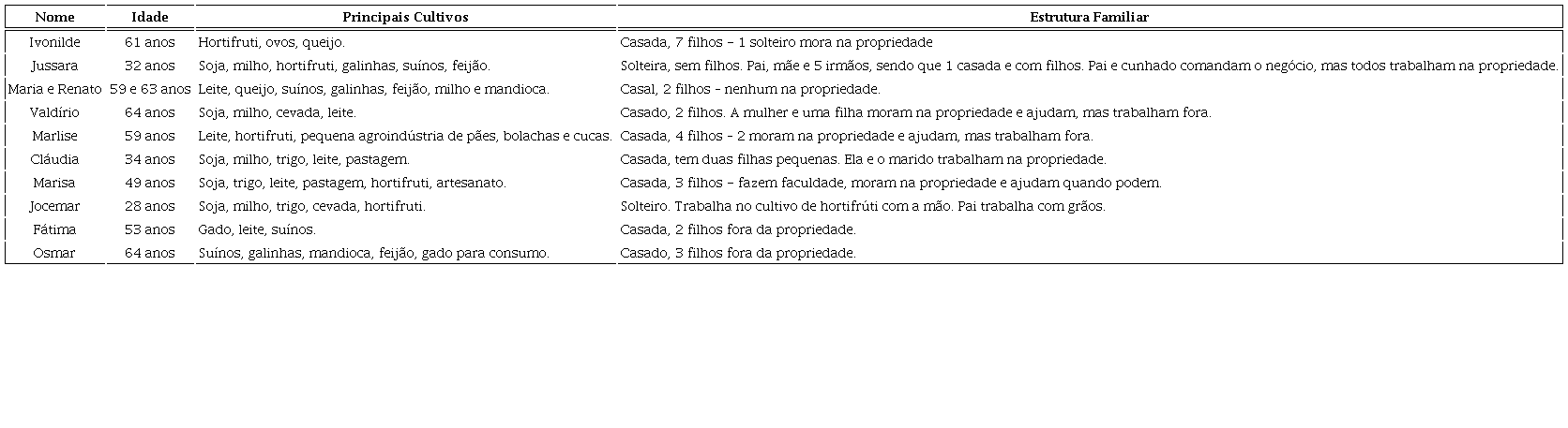 A coleta de dados envolveu entrevistas em profundidade com 10 agricultores familiares, habitantes da região norte do Rio Grande do Sul. Para a condução das entrevistas, foi elaborado um roteiro com perguntas abertas, abordando como aspectos principais o histórico dos produtores na atividade, os significados culturais acerca do alimento e da agricultura familiar e as relações sociais dos produtores. Apesar da utilização do roteiro, a condução das entrevistas buscou capturar as respostas subjetivas de cada entrevistado, sem se atrelar restritamente ao roteiro e seguindo o fluxo da conversa. Todas as entrevistas foram transcritas e organizadas por entrevistado, para dar suporte à análise dos dados. O Quadro 1 identifica cada um dos participantes do estudo e a estrutura das propriedades rurais.