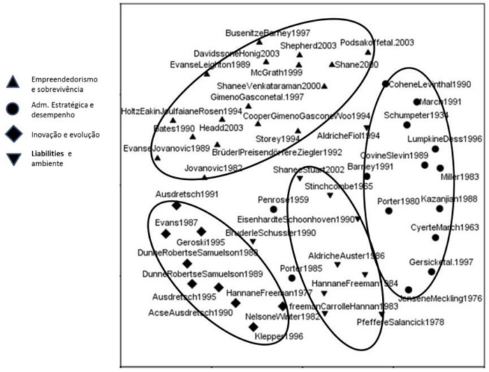 A análise do diagrama resultante do MDS (Figura 1) permite a identificação de agrupamentos de artigos e, pelo conteúdo destes, podem ser reconhecidos temas relacionados ao estudo de declínio organizacional: empreendedorismo e sobrevivência; administração estratégica e desempenho; inovação e evolução e liabilities e ambiente. É importante notar que esses temas foram confirmados por meio do uso de outra técnica estatística, a análise fatorial exploratória (Tabela 4).