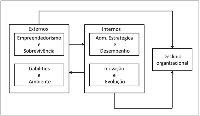 As quatro vertentes de análise do processo de declínio apontaram para fatores internos e externos. As pesquisas se amparam em teorias que focam essas duas dimensões. Fatores externos são os que implicam numa transação entre a empresa e o meio ambiente e são, nos estudos sobre declínio, relacionados à idade, tamanho e adaptação contidos nas perspectivas da ecologia, e também fatores ligados ao ciclo de vida, reconhecimento de oportunidades e competitividade ancoradas na teoria porteriana. Fatores internos estão ligados à exploração e prospecção de recursos e à governança, principalmente em aspectos de aprendizagem e tomada de decisões. Aspectos ligados ao empreendedorismo e adaptação ao ambiente, superando pressões institucionais e pressões de mercado têm maior externalidade. A ação empreendedora traz subjacente a adoção de risco e incerteza quanto ao sucesso da empresa. As ameaças são muitas no começo de vida da empresa, associadas ao pequeno porte e à complexidade que envolve a conquista da legitimidade junto aos atores externos, condição indispensável para superar os primeiros anos.