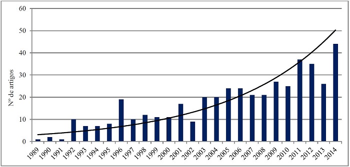 O Gráfico 1 apresenta a publicação anual dos artigos. A visão da amostra obtida indica que a produção de trabalhos sobre o tema é crescente, como indicado pela curva de tendência. No período pesquisado de 1989 a 2014, 50% dos trabalhos foram produzidos nos últimos oito anos e cerca de 25% nos últimos três anos.