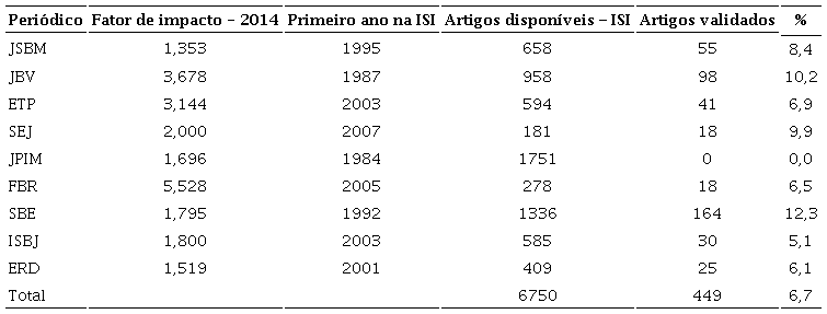 Foram selecionados os principais periódicos de administração voltados a pequenas empresas com fator de impacto superior a 1,4 (avaliação Capes - Qualis A1) publicado no Journal Citation Reports, no portal ISI – Web of Knowledge, exceto o Journal of Small Business Management cujo fator de impacto é de 1,353, mas mantido na seleção por ser um periódico especializado no tema da pesquisa (Tabela 1).