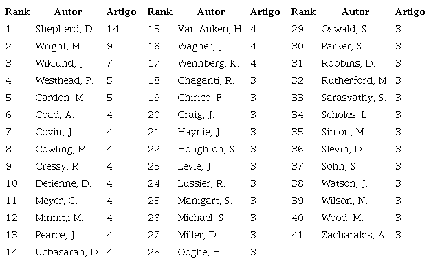 A amostra desta pesquisa composta por 449 artigos utilizou 786 autores. A relação dos mais prolíficos encontra-se na Tabela 2. Vale notar que os cinco primeiros tiveram sua produção após 2005, com exceção para D. Shepherd, com três artigos anteriores, fato que comprova a tendência crescente em pesquisas sobre declínio em pequenas empresas. Três temas destacam-se dentre os artigos destes cinco autores: aspectos cognitivos relacionados à aprendizagem com o fracasso e experiência adquirida para favorecer sucesso de novas empreitadas; emoções dos fundadores em criar novas empresas, dirigidos por aproveitamento de oportunidades, ou alternativa para geração de renda e orientação e formulação estratégica com objetivo de prolongar a sobrevivência e buscar desempenho.