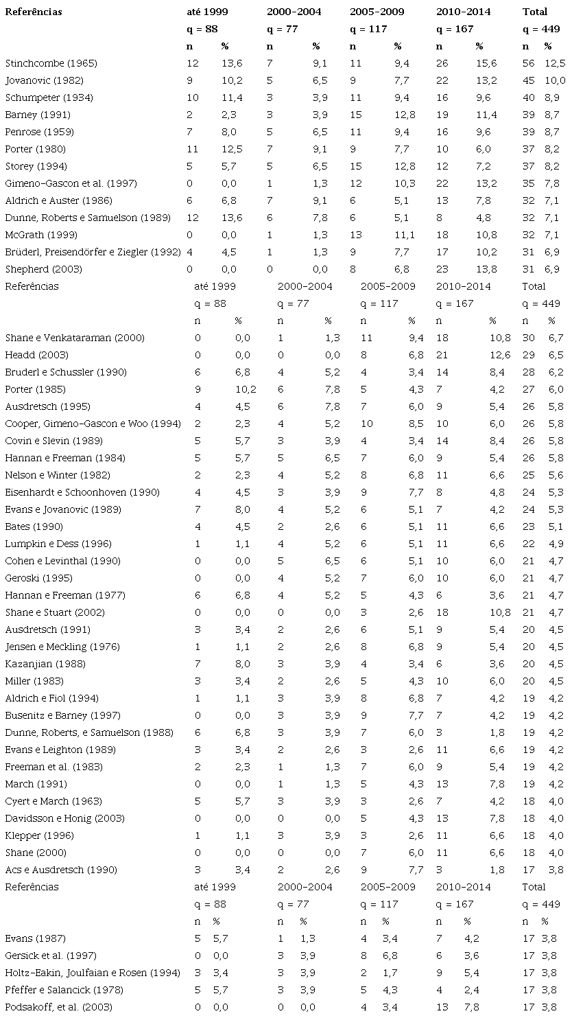 A análise de citações tem por finalidade a identificação das obras de maior influência na amostra por meio da contagem de vezes em que foi usada. Os 449 trabalhos da amostra usaram 15316 referências, estando as 50 mais citadas na Tabela 3. O mais citado foi o trabalho de Stinchcombe, de 1965, Social Structure and Organizations, com 56 citações (12,5% da amostra), sobre o efeito da estrutura social na fundação e desempenho e definiu as ameaças decorrentes do noviciado e do porte da empresa. O segundo mais citado, Jovanovic (1982), aborda a relação entre taxas crescimento e de sobrevivência com desempenho. A seguir, Schumpeter (1934) analisa características do empreendedor e seu papel de inovador, demarcando um novo ciclo de prosperidade econômica. O quarto e quinto artigos mais citados são trabalhos de Teoria Baseada em Recursos, definindo condições de aproveitamento de recursos para obtenção de vantagens competitivas (BARNEY, 1991) e condições para o crescimento da empresa (PENROSE, 1959). Essa diversidade de abordagens e de teorias confirma a multidisciplinaridade no estudo de declínio trazida por Serra, Ferreira e Almeida (2013).