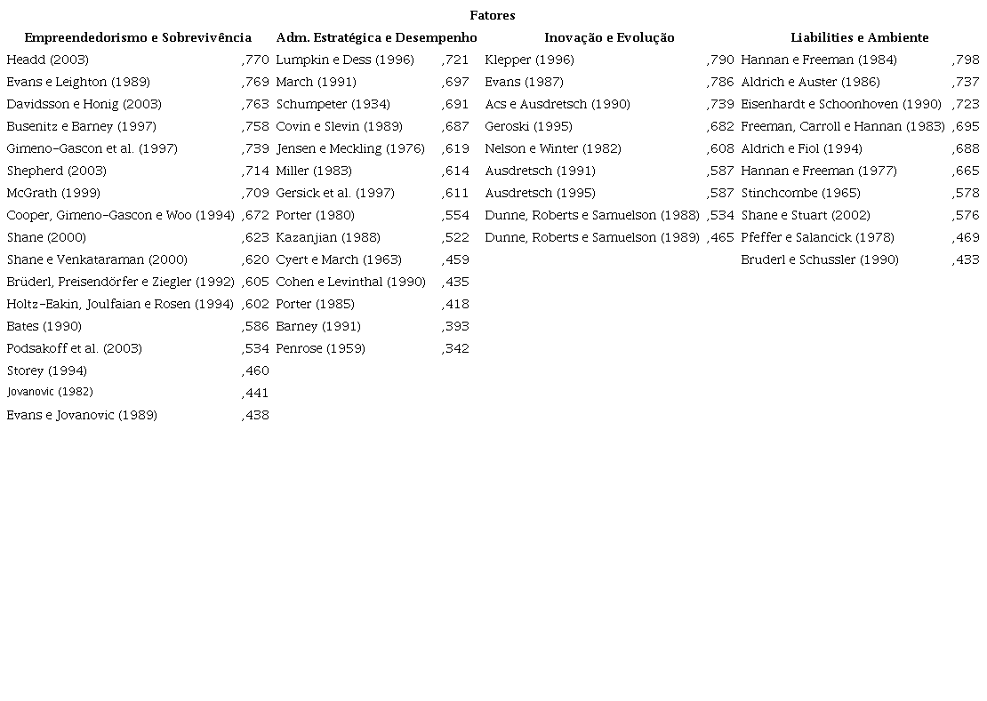 A análise de cocitação mede o grau de ligação de um par de artigos, pelo número de documentos onde esses artigos são citados, simultaneamente (GUEDES; BORSCHIVER, 2005). O resultado obtido permite, por meio de uma análise fatorial exploratória, obter agrupamentos de autores e trabalhos determinados pela similaridade percebida entre eles (LIN; CHENG, 2010), Tabela 4. Os grupos ou fatores representam as abordagens teóricas usadas na amostra e são nomeados após leitura dos trabalhos para identificação da teoria abordada e de como se relacionam (RAMOS-RODRÍGUEZ; RUÍZ-NAVARRO, 2004). Os quatro fatores resultantes desta análise fatorial, processada pelo software SPSS, versão 20, foram nomeados conforme segue: empreendedorismo e sobrevivência; administração estratégica e desempenho; inovação e evolução e liabilities4 e ambiente e explicam 51,2% da variância da amostra dos 50 trabalhos mais citados. As cargas fatoriais, colocadas logo após a identificação da referência representa o quanto o dado artigo pertence ao fator. A análise fatorial foi processada para todo o período e para cada subperíodo de cinco anos.