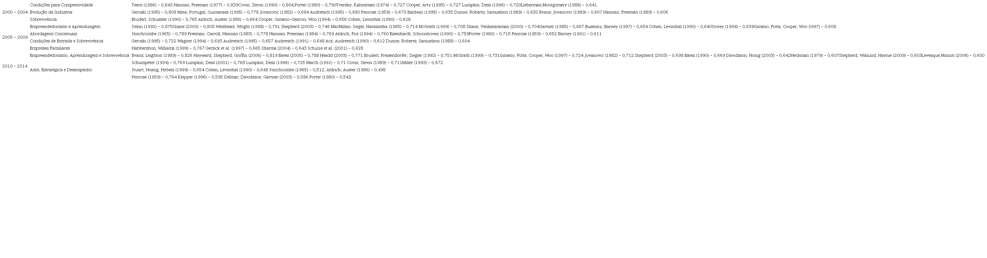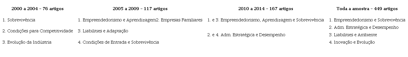 Para o primeiro período foram usados 76 dos 449 artigos da amostra. Foram obtidos três fatores com 53% da variância explicada. Cada subfator, pela proximidade conceitual determinada pela análise fatorial, foi nomeado. Em Condições para Competitividade são relacionados fatores impulsionadores da competitividade: Teece (1986) abordou a inovação; Hannan e Freeman (1977) trouxeram a necessidade de adaptação; Covin e Slevin (1990) abordaram postura estratégica e desempenho. O segundo subfator, Evolução da Indústria, tem vários trabalhos sobre condições de entrada de novas empresas (DUNNE; ROBERTS; SAMUELSON, 1989; GEROSKI; 1995; MATA; PORTUGAL; GUIMARAES, 1995) e o papel que empresas de pequeno porte têm na evolução de determinada indústria, seja por trazerem inovações ou por serem vetores da seleção dentro da indústria (JOVANOVIC, 1982; AUDRETSCH, 1995). O terceiro subfator, Sobrevivência, traz artigos sobre riscos à sobrevivência, como problemas de infância e de adolescência (BRUDERL; SCHUSSER, 1990) e necessidade de aprendizagem para mitigar riscos (COHEN; LEVINTHAL, 1990; COOPER; GIMENO-GASCON; WOO, 1994).